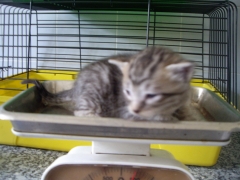 É un dos 5 cativos da camada atopada en Conxo xunto a súa nai. Apenas teñen tres semanas, moi bonitos e pequechos.