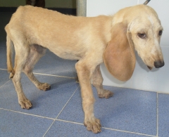Chega en moi malas condicións, moi delgada, débil e vomita. Ademais ten o rabiño partido.