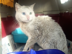 Atopado onde o bar Tío Gilito, na Praza de Vigo. Ten un ollo verde e outro azul.