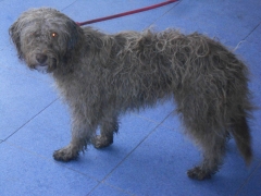 Atopado no monte de Zarramacedo por unha madriña cando estaba paseando os seus cans. Chega mollado e cheo de nós con silveiras na súa pelaxe. Moi boíño e xogueton.