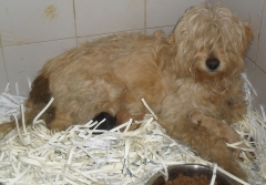 Atopada xunto cos seus 4 cativos recién nados. É boa e cariñosa e, aínda que está moi nerviosa se non está cos cachorros, confia na xente. Ten o pelo en mal estado e está moi delgada.