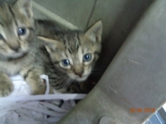 Atopado cos seus tres irmans, no Centro Hipico La Lagunita,típica camada de 4 gatiños.Moi boíños.Irman de 197-18 Badger, 199-18 Belle e 200-18 Gracie