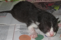 Atopado coa súa nai e 7 irmáns máis dentro dun contedor de lkixo, cheos de xel de baño, preto de Conxo.A camada ten apenas 5 días.
