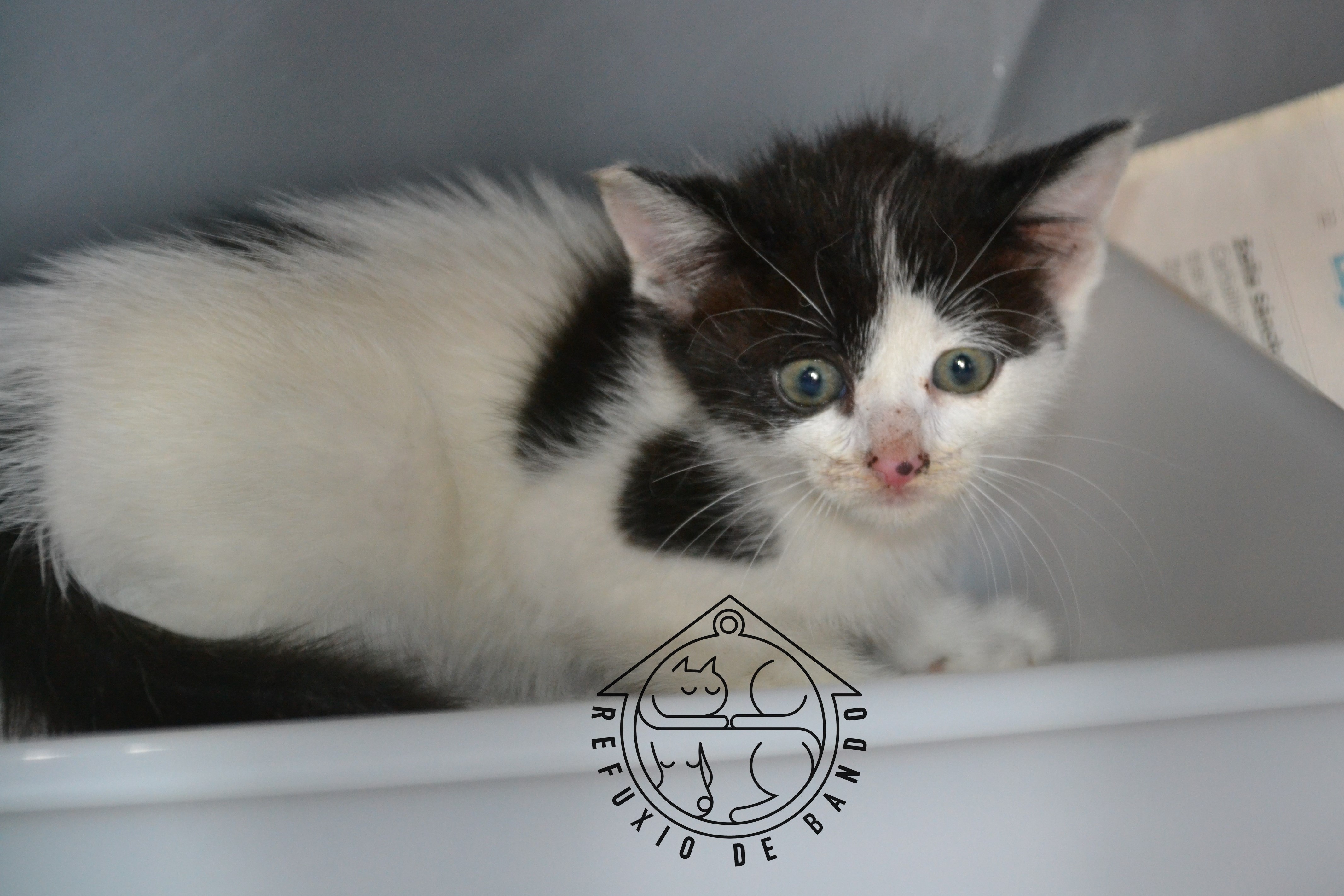Recollido en Santiago de Compostela, onde estaba atrapado nunha tubería desde había varios días. Parece un gatiño rueiro, moi medroso, pero pouco a pouco vai collendo confianza.