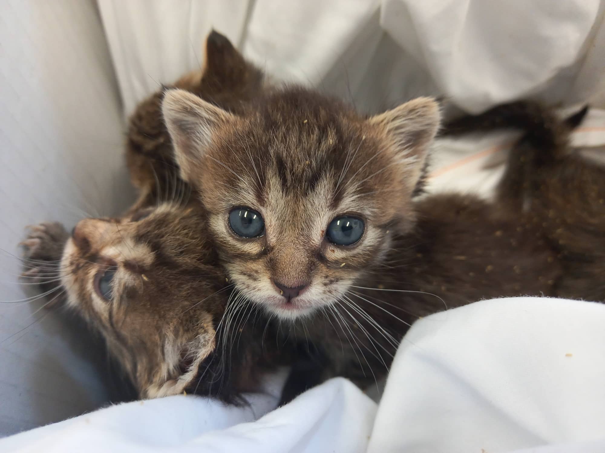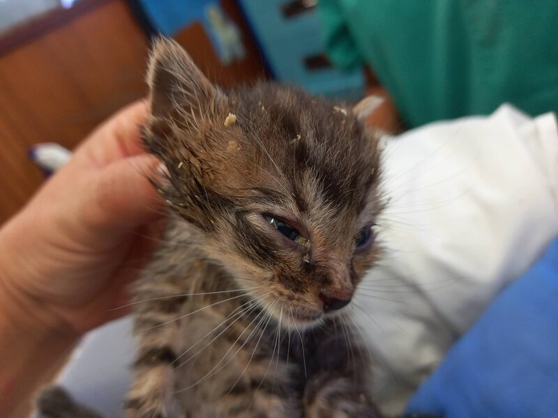 Recollido xunto cos seus tres irmáns na zona de San Marcos (Santiago de Compostela), moi febles e cheos de ovos e larvas de mosca. Son gatiños de biberón, polo que se atopan nunha casa de acollida.
