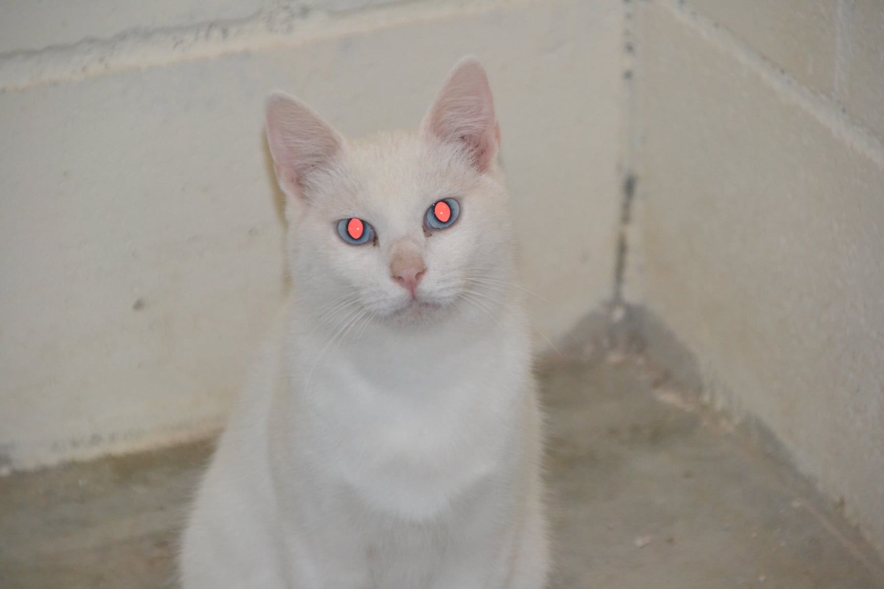 Recollido en Santiago de Compostela. Cando chegou era moi medroso e non parecía acostumado a estar con xente, pero pouco a pouco foi collendo confianza. Segue a ser algo tímido pero é boíño, tranquilo e lévase ben con outros gatos. É sordo.