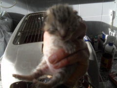 Atopado nunha caixa cos seus tres irmáns na porta do Refuxio. A nai rompeu a caixa e estaba libre preto do Refuxio.