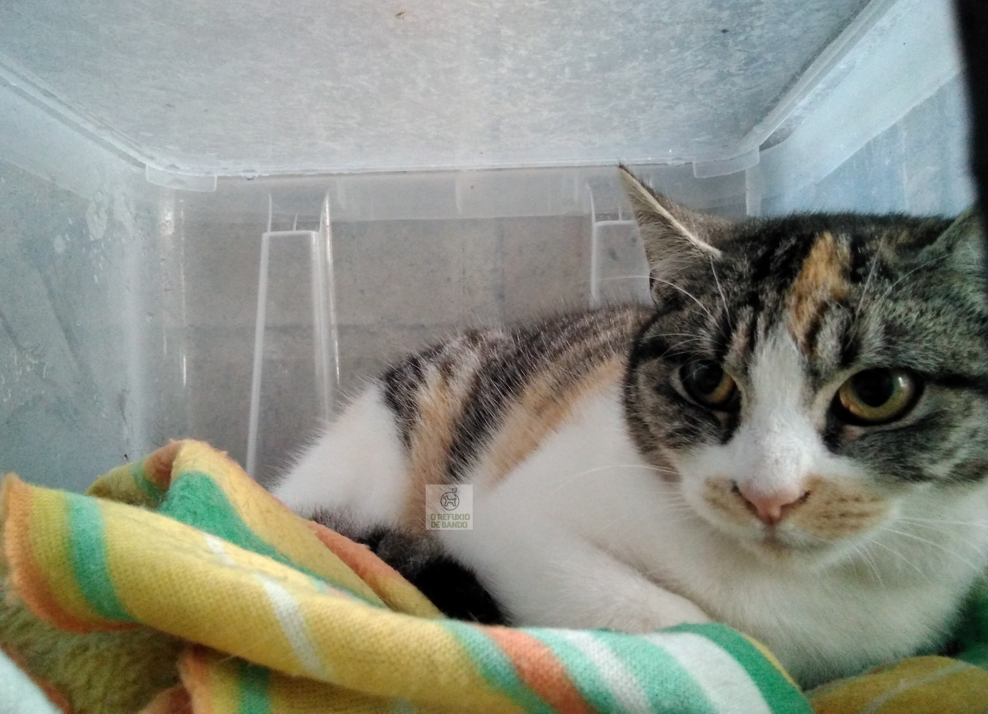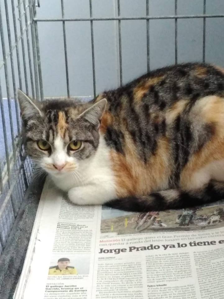 Pepereta foi recollida en Teo xunto a outros dous gatiños, Peperetillo e Peperete. Non están acostumados a estar con xente e estalles custando adaptarse ao Refuxio. Son boíños pero moi medrosos.
