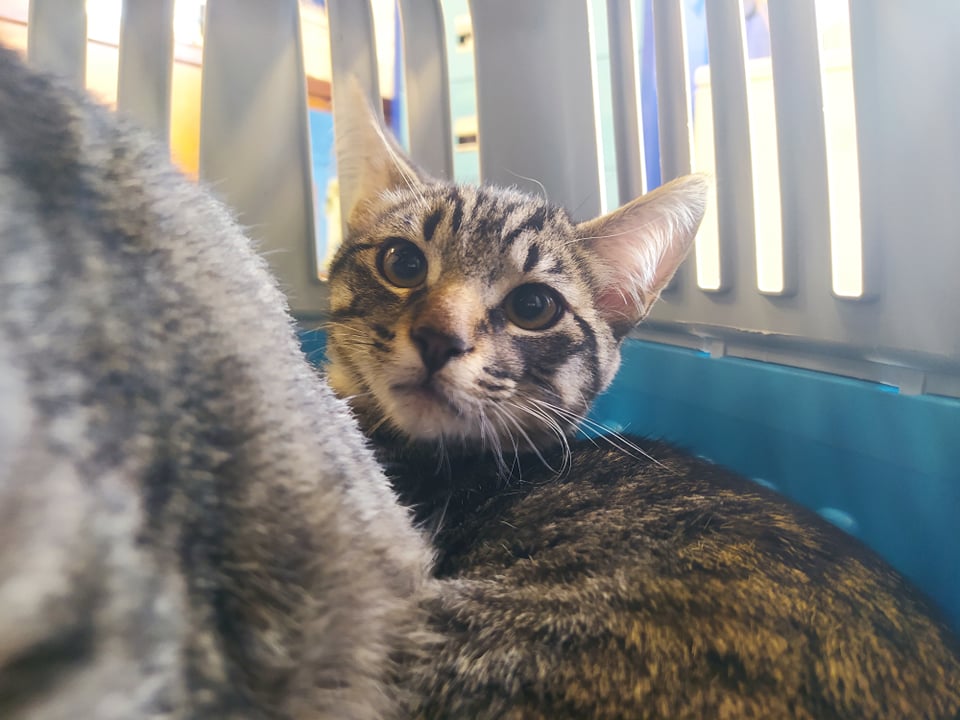 Adoptado no Refuxio xunto co seu irmán e devolto por motivos totalmente alleos a el. É un gatiño moi sociable, acostumado a vivir en familia desde recén nacido.