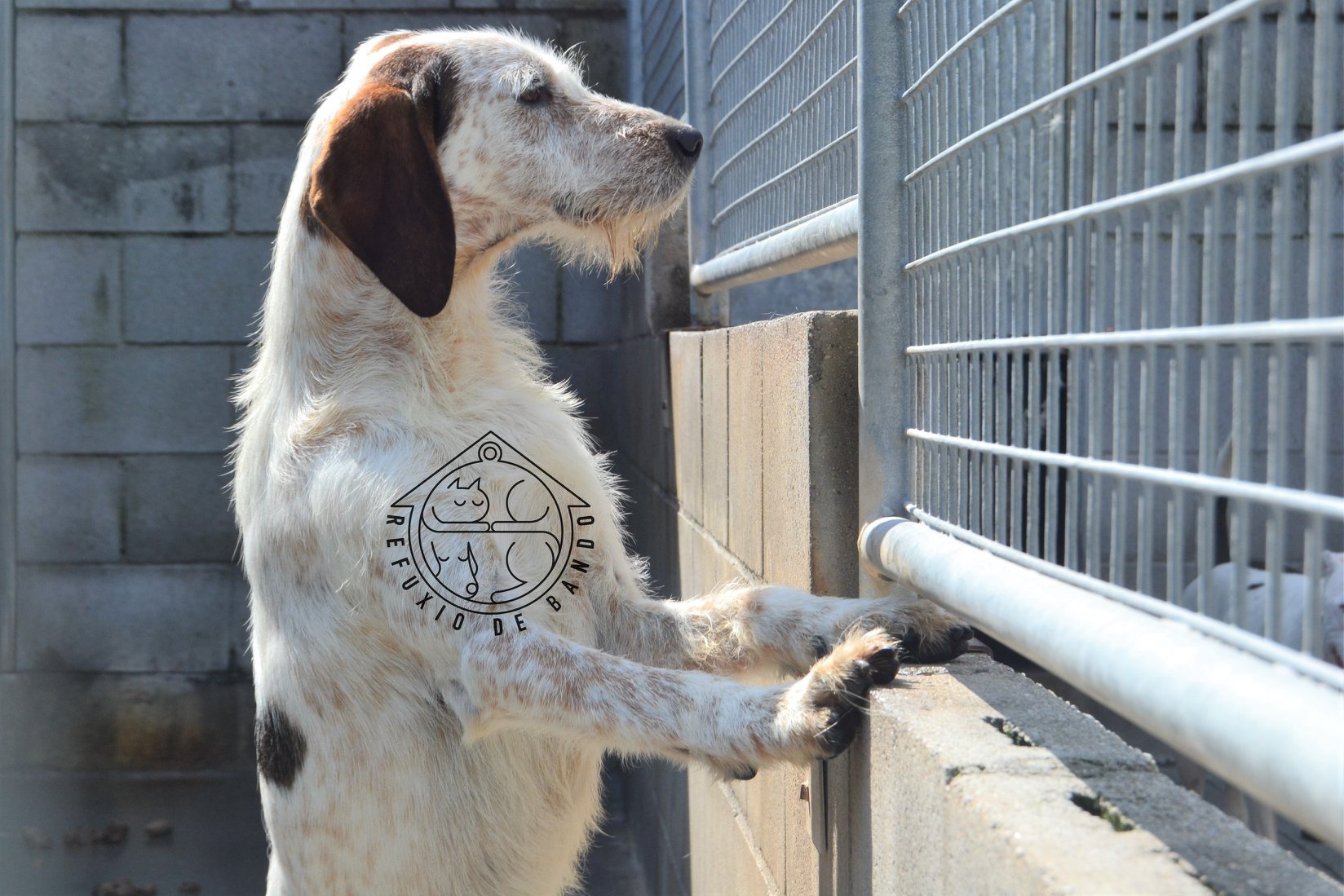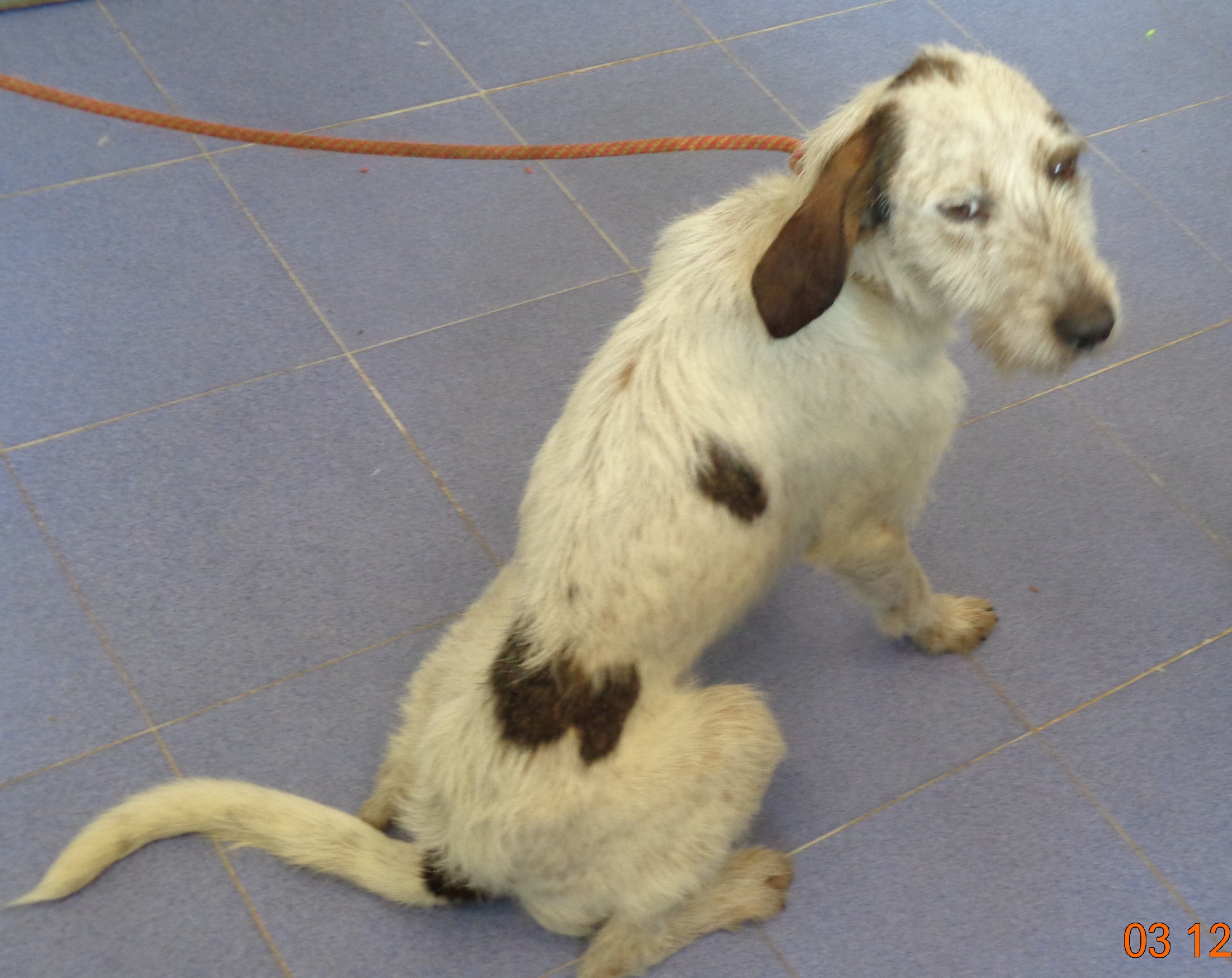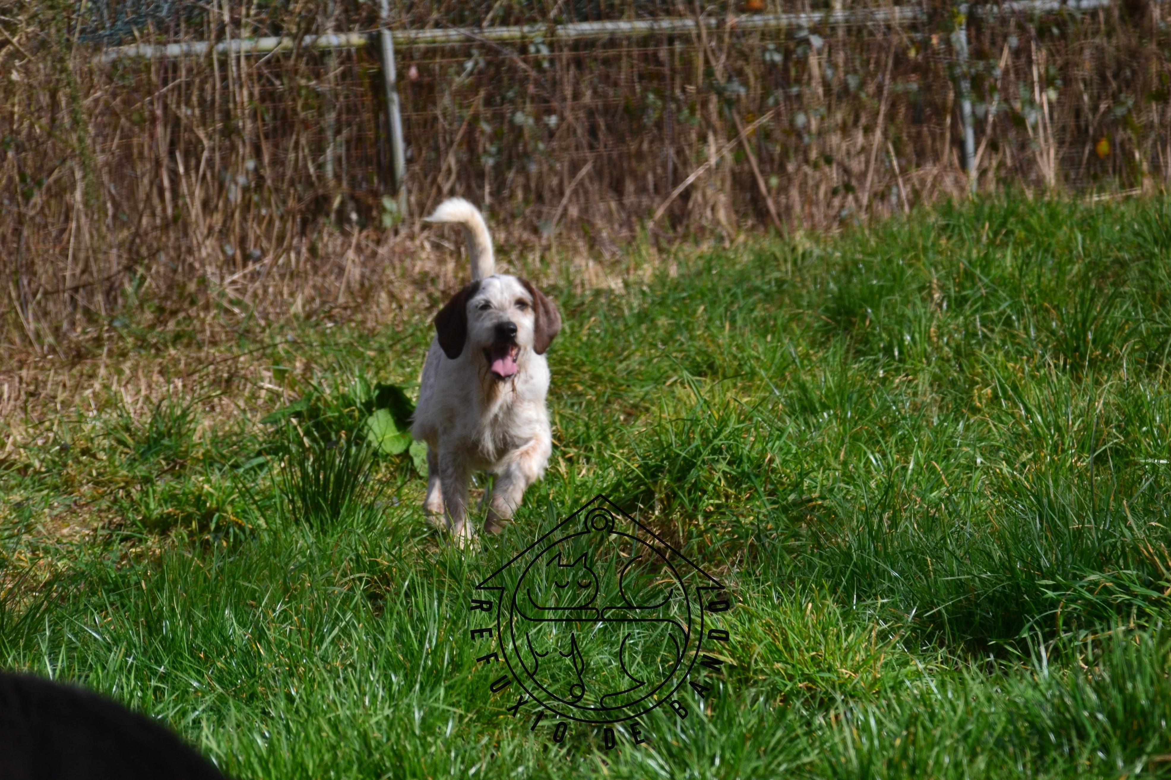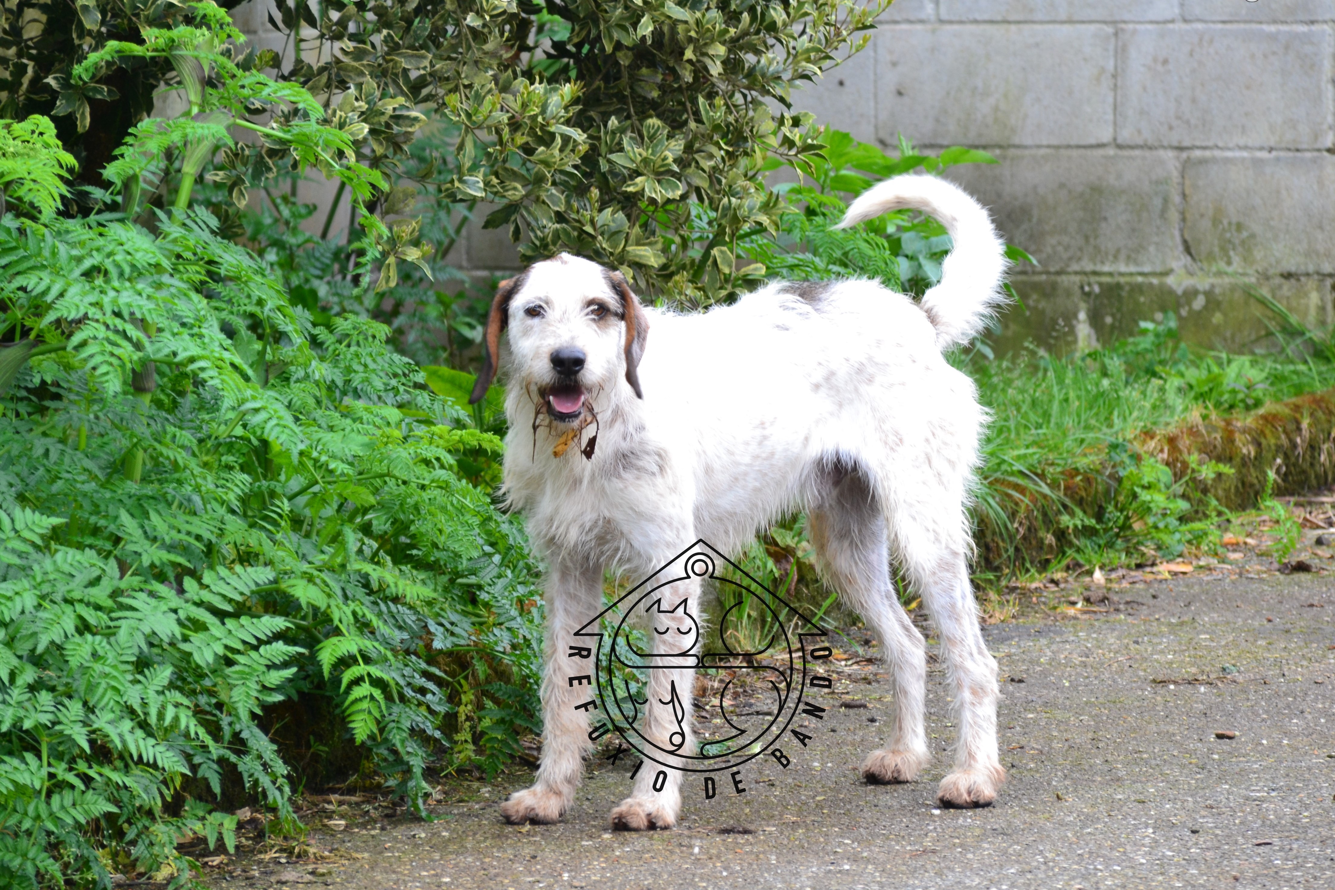 Geoffrey foi recollido en San Lázaro (Santiago de Compostela), moi delgado e sen chip. É un canciño dócil pero medroso.