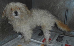 Vagabundea pola estrada de Lavacolla. Ten o pelo en moi mal estado. Está moi asustado e ladra moito, pero só ten medo.