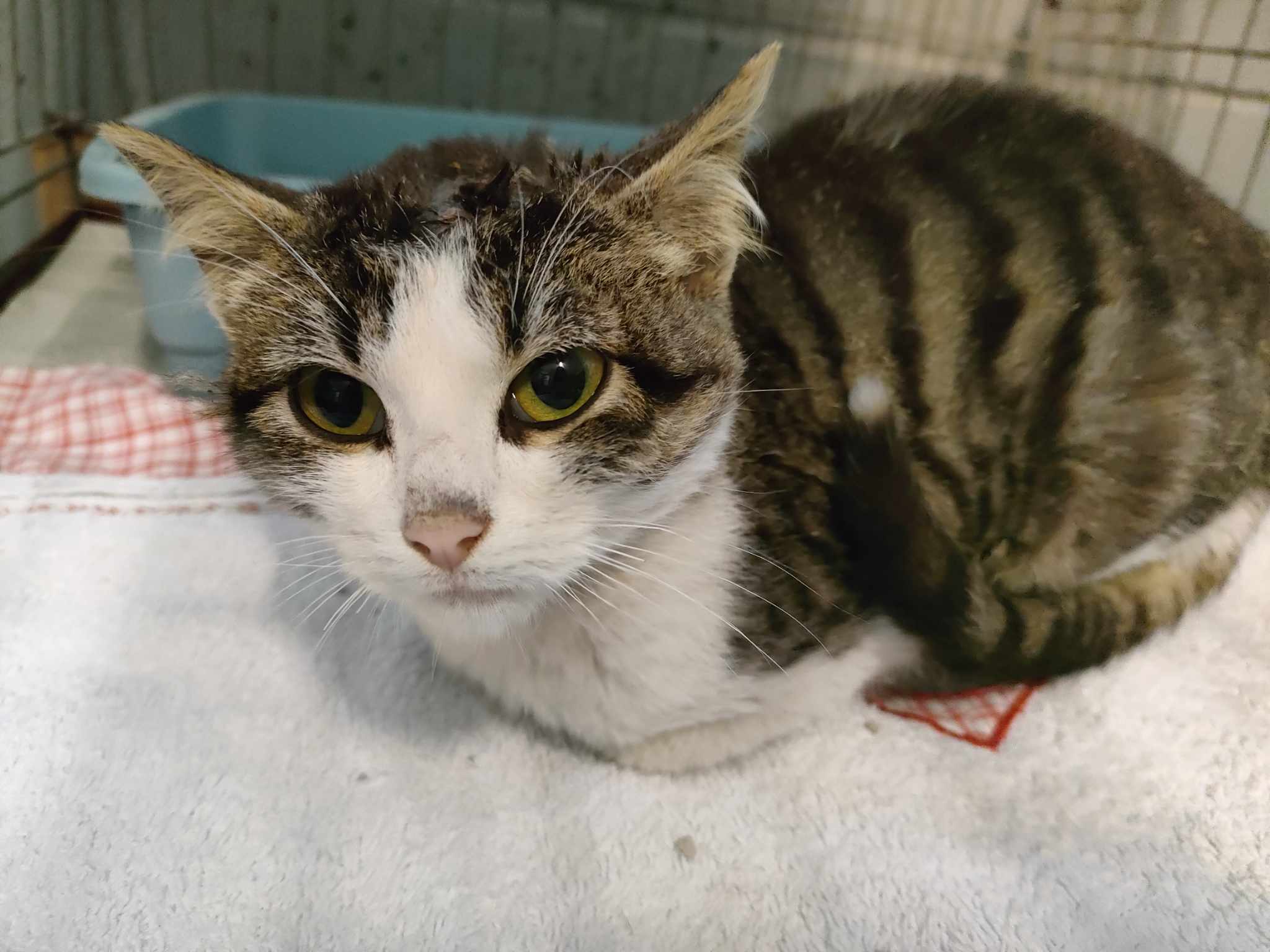 Recollido en Santiago de Compostela, chega ferido. Moi boíño.