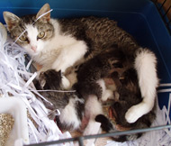 Deixaron abandonada a nai e cinco gatiños a 200 metros da súa casa, nunha caixa de cartón, e cando ía de paseo atopouse con eles.