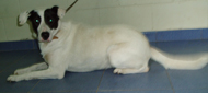 Atopada no aeroporto. Está moi asustada, parece que ten as manchas pintadas. Non parece haber tido unha correa no pescozo na súa vida. É cariñosa aínda que o medo fai que lle coste achegarse á xente.