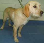 Atópano fai 8 días, ven como un coche o golpea e marcha. Quedan con él uns días ata que se recupera. Non se leva ben con outro can que adoptaron.